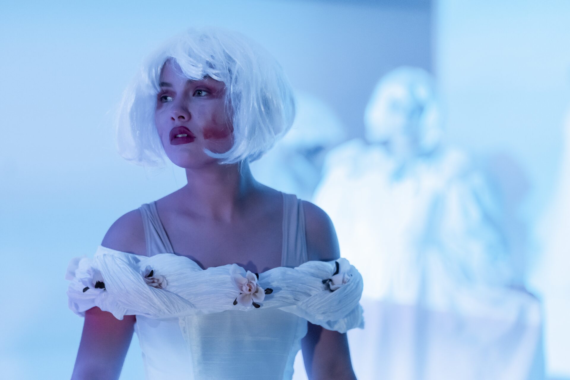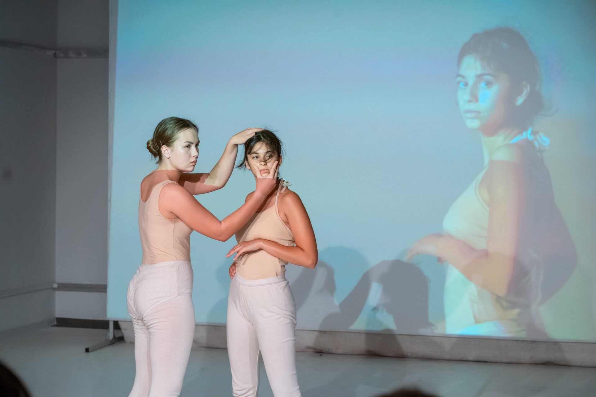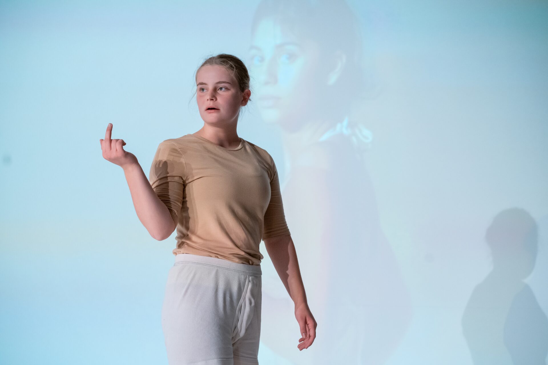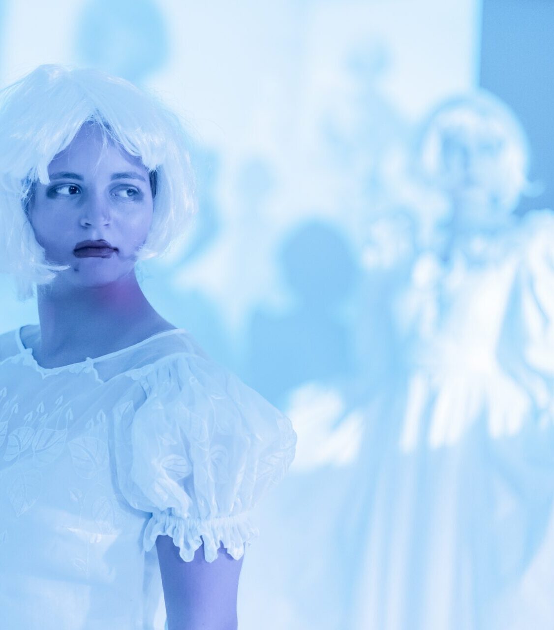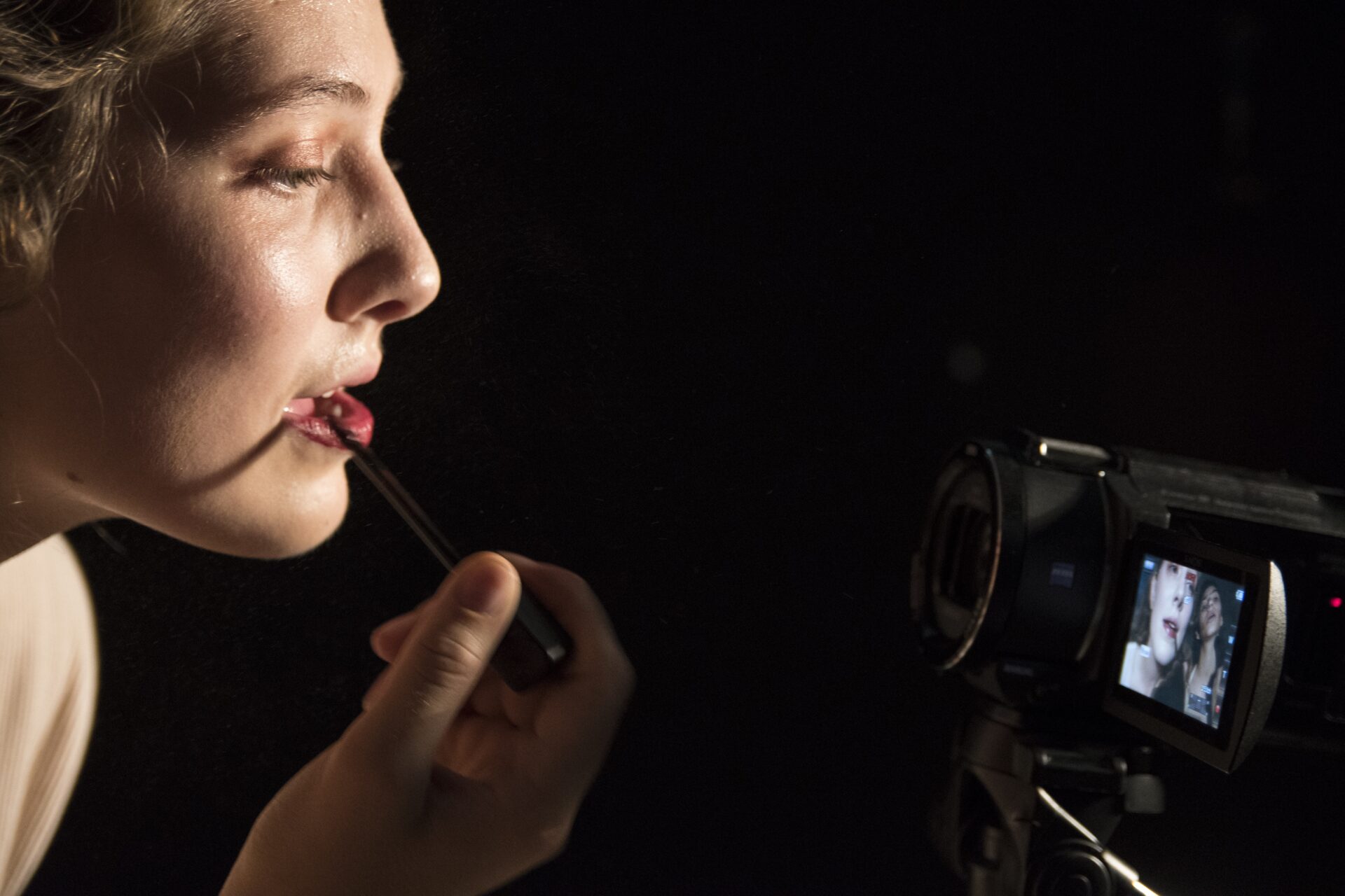 » Dabei werden nicht nur provokante Fragen gestellt, sondern mit Witz und einem erstaunlichen Gespür für Absurdes weitere Dimensionen des Themas eröffnet. Etwa wenn sich zwei Akteurinnen als Youtube-Influencerinnen in Sachen Kosmetik vor die Kamera wie vor einem großen Spiegel stellen und beim Schminken ihre Tipps abgeben. Eine groteske Show wird daraus – die Gesichter sind gleichzeitig in Großaufnahme auf die Bühnenrückwand projiziert – weil sich das Duo einen sensationellen Schlagabtausch liefert zwischen Werbetext und geschminkter Maskerade. «